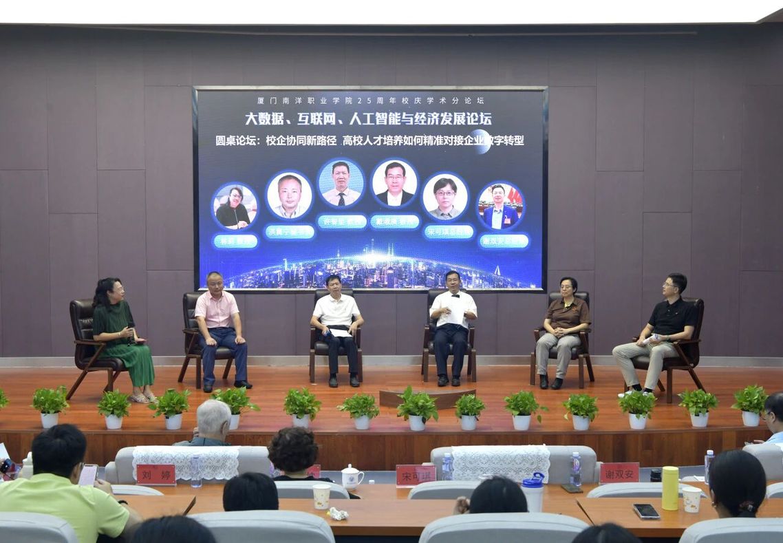 主旨报告结束后,论坛以“校企协同新路径:高校人才培养如何精准对接企业数字转型”为主题开展圆桌对话。厦门大学金融系国际金融教研室主任、厦门南洋学院经济管理学院学术副院长戴淑庚教授,厦门南洋学院副校长许智坚教授、厦门市校友经济促进会洪冀宁秘书长,厦门市台商投资企业协会理事、厦门正旸物流有限公司宋可琪总经理,翔安区大嶝新联会会长、厦门兴安泰科技有限公司谢双安总经理参加会议。厦门南洋学院经济管理学院/三创学院院长林莉教授主持圆桌对话。