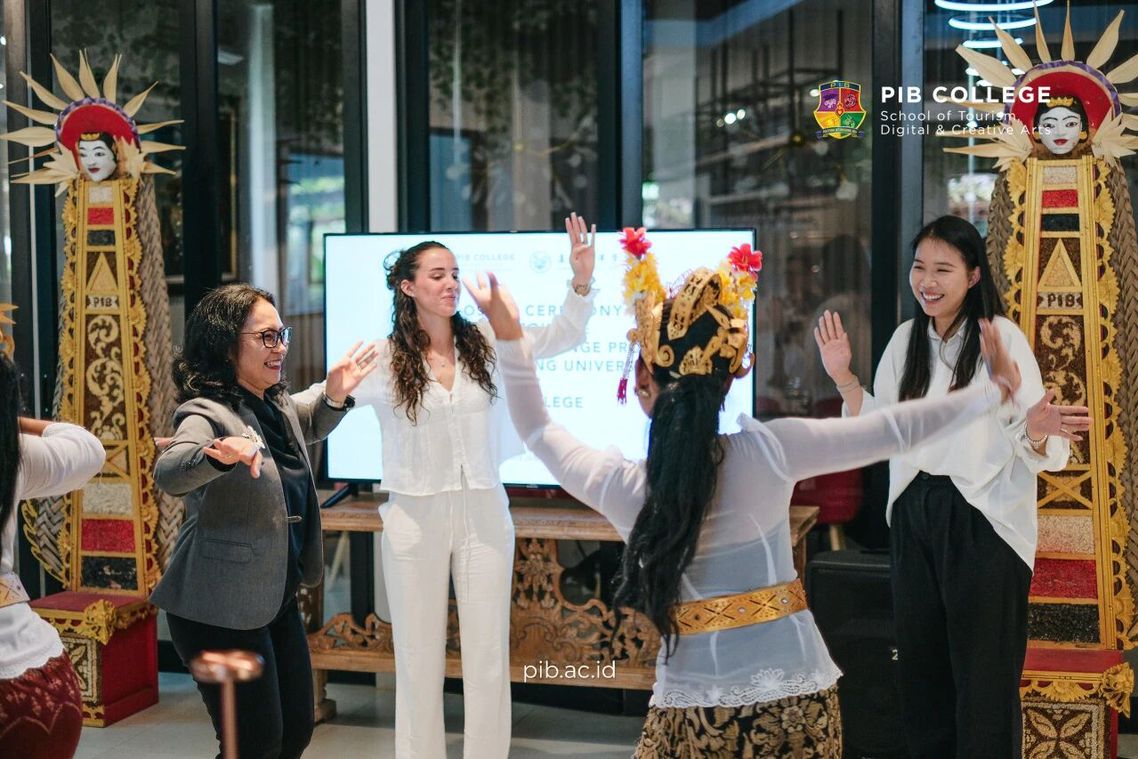 2025年4月25日,带队老师李薇(右一)与巴厘岛理工学院Erika(左一)在研学结营典礼一起跳舞