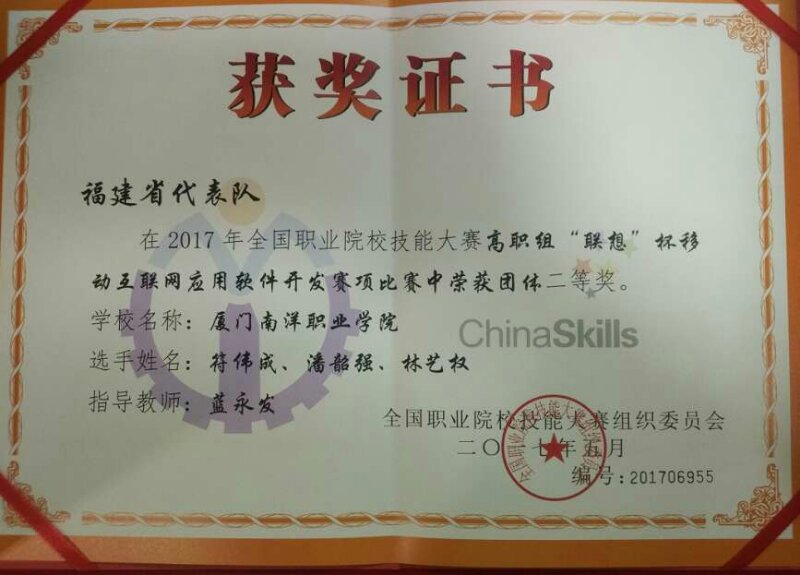 6月7日,南京工业职业学院,2017年全国职业院校技能大赛移动互联网应用软件开发赛在这里落下帷幕,厦门南洋学院取得二等奖的优异成绩。