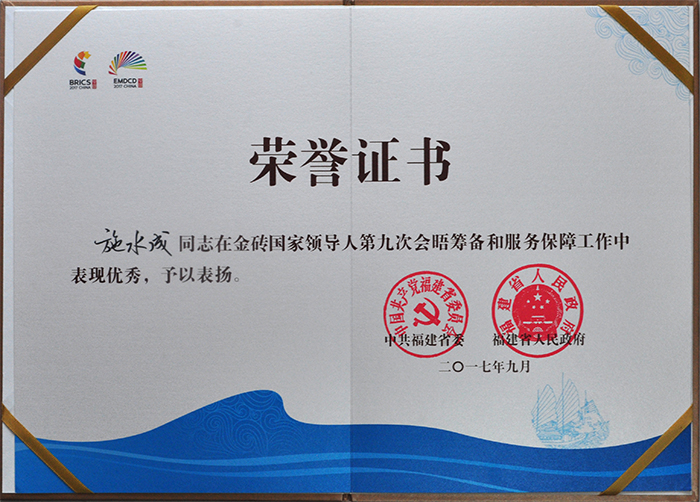日前,省委省政府颁发证书,表彰我校党委书记施水成同志在金砖国家领导人第九次会晤筹备和服务保障工作中的优秀表现。