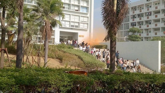9:38,随着火警警报声响起,教学楼、实训楼内全体师生在各个疏散小组成员的指挥下,5分钟内迅速到达指定地点,整队集合、清点人数、报告人数、小结讲评;学校志愿消防队员迅速组织“灭火”;救护组第一时间对“伤员”组织抢救。