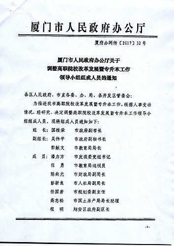 日前,厦门市人民政府正式发文调整高职院校改革发展暨专升本工作领导小组组成人员,组长由副市长国桂荣担任,市政府副秘书长吴伟平、教育局局长郭献文任副组长,成员有市政府各相关职能部门人员及我校董事长鲁加升、校长王豫生等,市教育局巡视员任勇兼任办公室主任。