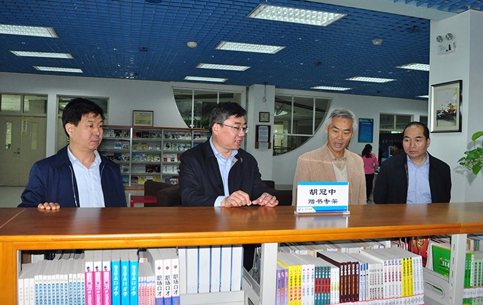 在图书馆一楼会议室,校领导结合PPT向客人介绍了我校的办学历史、办学理念和发展前景,大家就新时代如何把握高等教育发展契机进行了深入探讨。
