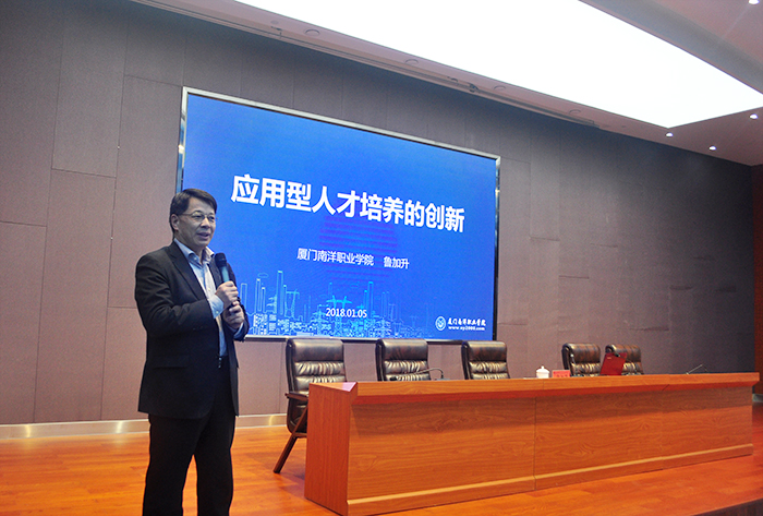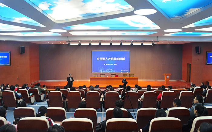 我校董事长、执行校长鲁加升作了题为“应用型人才培养的创新”的报告。报告从怎么认识我们的学生、怎么对待我们的学生、怎么培养我们的学生切入,深入浅出地探讨如何为学生成长成才搭建平台。幽默的语言、新颖的论点、精辟的论证把重大的话题阐释得简单明了,在场听众连连惊呼“接地气”“超实用”。