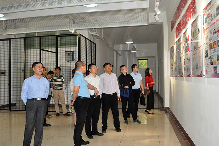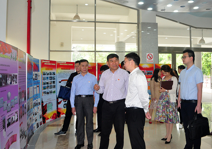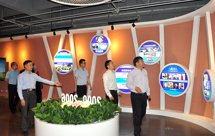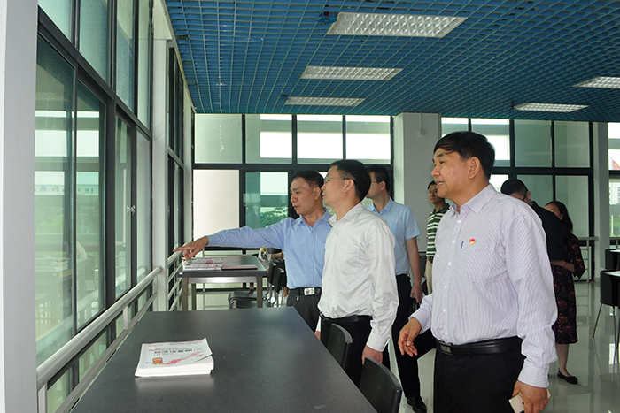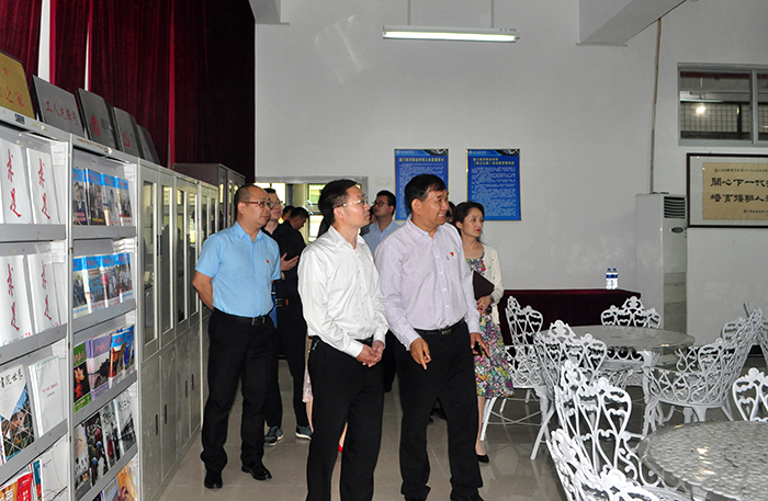 走出学生创业活动中心,谢舒展主任一行来到图书馆,先后察看了仙岳报告厅、阅览室、校史展览馆。在校史馆,谢舒展主任一边浏览各种展品,一边询问学校的专业特点、就业情况,当得知学校“五个坚持”治校方略中包括“坚持党对学校思想政治工作的领导”时,他对学校董事会重视党建的做法表示赞赏,施水成书记汇报说,董事长鲁加升教授不仅是名老党员,还是我省唯一的中国民办教育协会党建工作委员会委员。