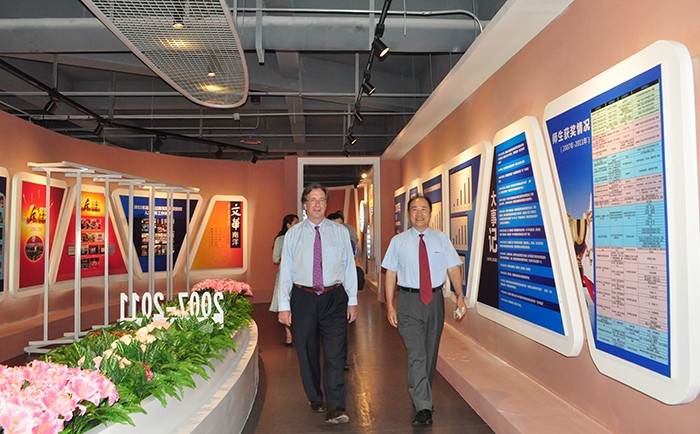 厦门南洋学院常务副校长康乃美陪同Tommy Bruce顾问一行先后参观了校史展览馆、图书馆、教学楼、实训楼。在校史展览馆,Tommy Bruce顾问一边参观一边询问南洋学院的办学理念。在图书馆,他用汉语“太棒了”不断表达着惊喜,当他看见天井被独具匠心地装饰成阅读区时高兴地表示,这跟纽约大学的图书馆一样;当他看到墙上从古到今的名人画像和名人小故事时赞叹道,这种会讲故事的建筑最吸引人。在教学楼,经济管理学院肖亮老师正在给学生讲授人力资源管理课,Tommy Bruce顾问一行走进教室,同学们热情地打着招呼,Tommy Bruce顾问一边回应同学们一边说,太羡慕南洋的学生了,能在这么美丽的校园里学习生活。走出教学楼, Tommy Bruce顾问一行来到位于实训楼一楼的实训车间,一群正在操作机器的学生热情地跟康乃美常务副校长打着招呼,旁边一名院长正满头大汗地带着学生修理机器,Tommy Bruce顾问感叹道,南洋学院的校长、院长怎么跟学生像哥们儿一样啊!在橱柜学院,他饶有兴致地参观着、询问着;在模拟机舱,他兴奋地在“南洋号”机舱前留影。
