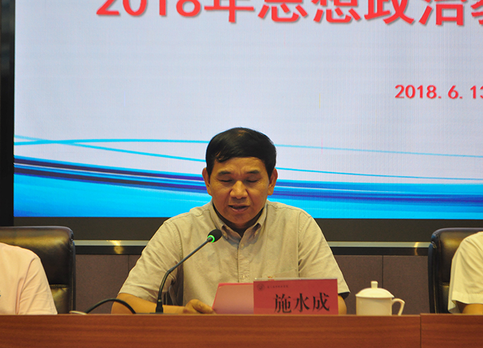 施水成书记布置了学习贯彻会议精神和王豫生校长讲话精神的任务,要求各单位精心组织学习,深入贯彻执行,要理论联系实际,增强学习成效,党员要率先示范,务求全面覆盖,辅导员是骨干,落实是重点。