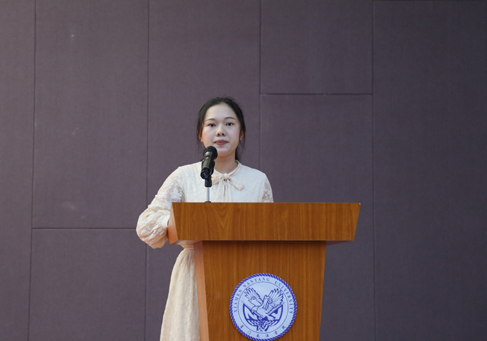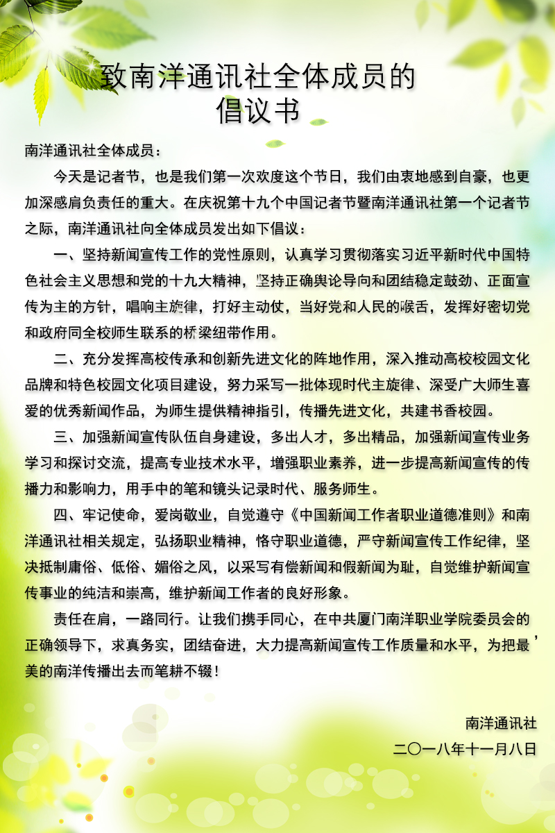 南洋通讯社学生记者代表吴美霖宣读了南洋通讯社致全体成员的倡议书。倡议书号召通讯社全体成员要在党委领导下,大力提高新闻宣传工作质量和水平,为把最美的南洋传播出去而笔耕不辍。