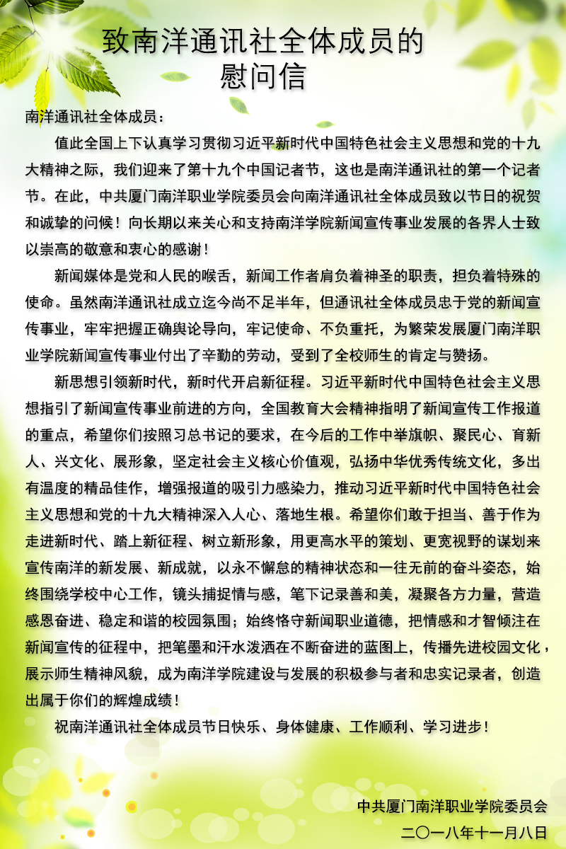 会上,党委委员、党政办主任李振杰宣读了学校党委致南洋通讯社全体成员的慰问信,向全体成员致以节日的祝贺和诚挚的问候。慰问信指出,习近平新时代中国特色社会主义思想指引了新闻宣传事业前进的方向,全国教育大会精神指明了新闻宣传工作报道的重点,全体成员要恪守新闻职业道德,传播先进校园文化,多出有温度的精品佳作,增强报道的吸引力感染力,推动习近平新时代中国特色社会主义思想和党的十九大精神深入人心、落地生根。
