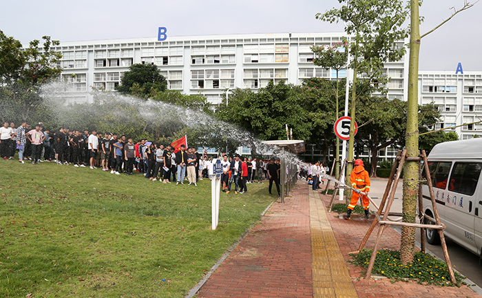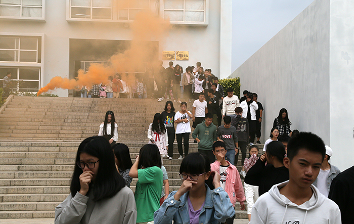 9:40,随着火警警报声响起,教学楼、实训楼、宿舍区内全体师生在各个疏散小组成员的指挥下,5分钟内迅速到达指定地点,整队集合、清点人数、报告人数、小结讲评、学校志愿消防队员迅速组织“灭火”。