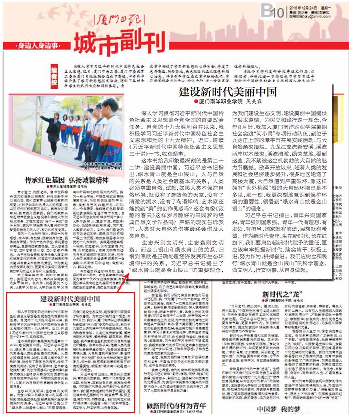 为深入学习习近平新时代中国特色社会主义思想,厦门市关工委、厦门市委教育工委与厦门日报社联合在厦门市高校、中专和中学开展学习新思想征文活动,得到各校青年学生的热烈响应和踊跃参与。厦门南洋学院吴美霖同学,是南洋通讯社成员,也是现任经济管理学院分团委学生会副主席、校学生会新闻广播中心主任、前国防绿色协会副会长。接到通知后她第一时间响应号召,组织班级同学积极参与征文活动。她以“建设新时代美丽中国”为题,在文章中畅谈了学习新思想的心得体会,表示要认真学习领会习近平生态文明思想,深刻把握绿水青山就是金山银山的科学理念,要内化于心,外化于行,树立环保意识,做文明人,行文明事,从自身做起。