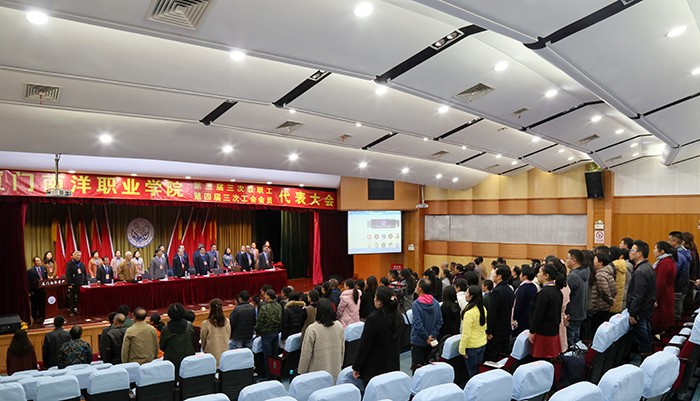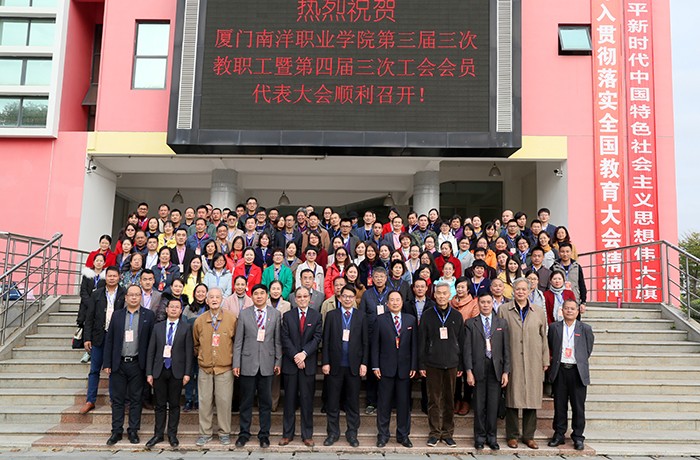 南洋社讯 昨日(1月2日)下午,厦门南洋学院三届三次教代会暨四届三次工代会在活动中心礼堂胜利闭幕。校领导王豫生、鲁加升、施水成、康乃美、潘世平、张东宏、何卫华、钟石根出席会议,董事长、执行校长鲁加升发表重要讲话,党委书记施水成主持会议,来自全校各单位的正式代表和列席代表135人参加会议。会议表决通过了学校工作报告、工会工作报告、《厦门南洋职业学院关于推进产教融合校企合作若干意见》情况说明的报告。