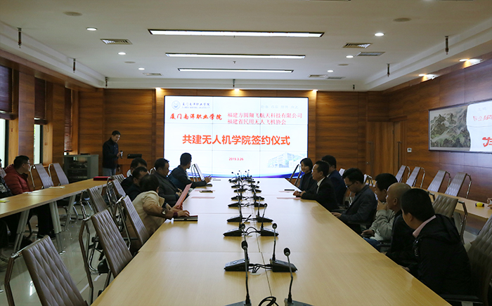 李建军会长向与会人员介绍了国内无人机产业发展情况及无人机在行业应用的背景,高度认可了南洋学院产学研人才培养模式。在双方签署合作协议后,鲁加升董事长宣布无人机学院正式成立,厦门南洋学院与福建省民用无人机协会、福建方圆翔飞航天科技有限公司“校、企、会”合作正式落地。