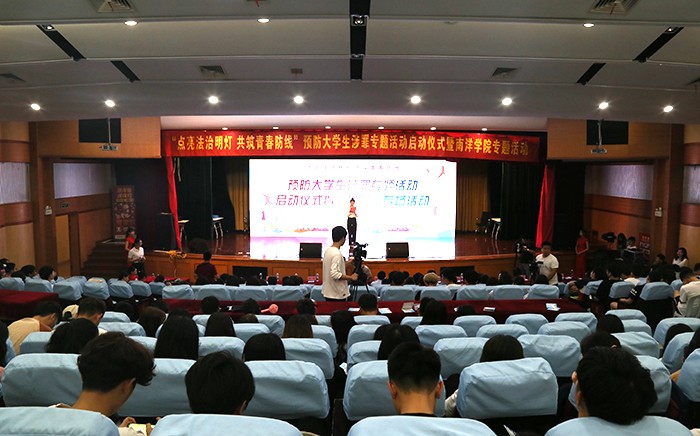 南洋社讯 4月28日下午,由翔安区检察院、翔安团区委等联合举办的“点亮法治明灯,共筑青春防线”预防大学生涉罪专题活动在厦门南洋学院活动中心礼堂启动。翔安区政法委副书记洪国煌,翔安区检察院副检察长吴筱云,翔安团区委书记郭闻文,翔安区新店镇派出所副所长蔡锡,工商银行翔安支行副行长方大任,南洋学院党委书记施水成,副校长何卫华及其他7所大中专院校代表出席仪式。各党总支书记、学工处相关负责人及部分学生参加仪式。
