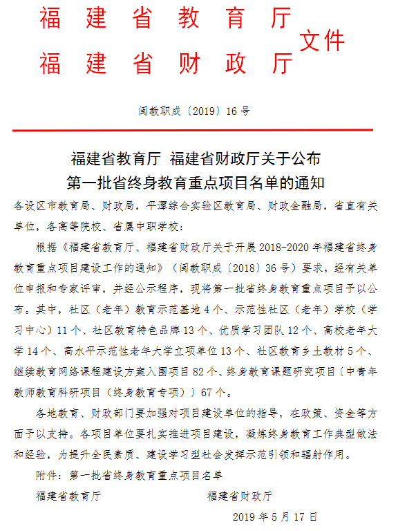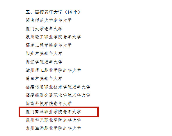 南洋社讯 近日,福建省教育厅、福建省财政厅联合下发《福建省教育厅 福建省财政厅关于公布第一批省终身教育重点项目名单的通知》,厦门南洋学院老年大学正式被批为“高校老年大学”重点建设项目。