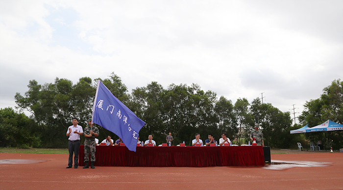 学工处处长林峰宣读2019级新生军训大队编成,党委书记施水成向承训部队负责人授旗。