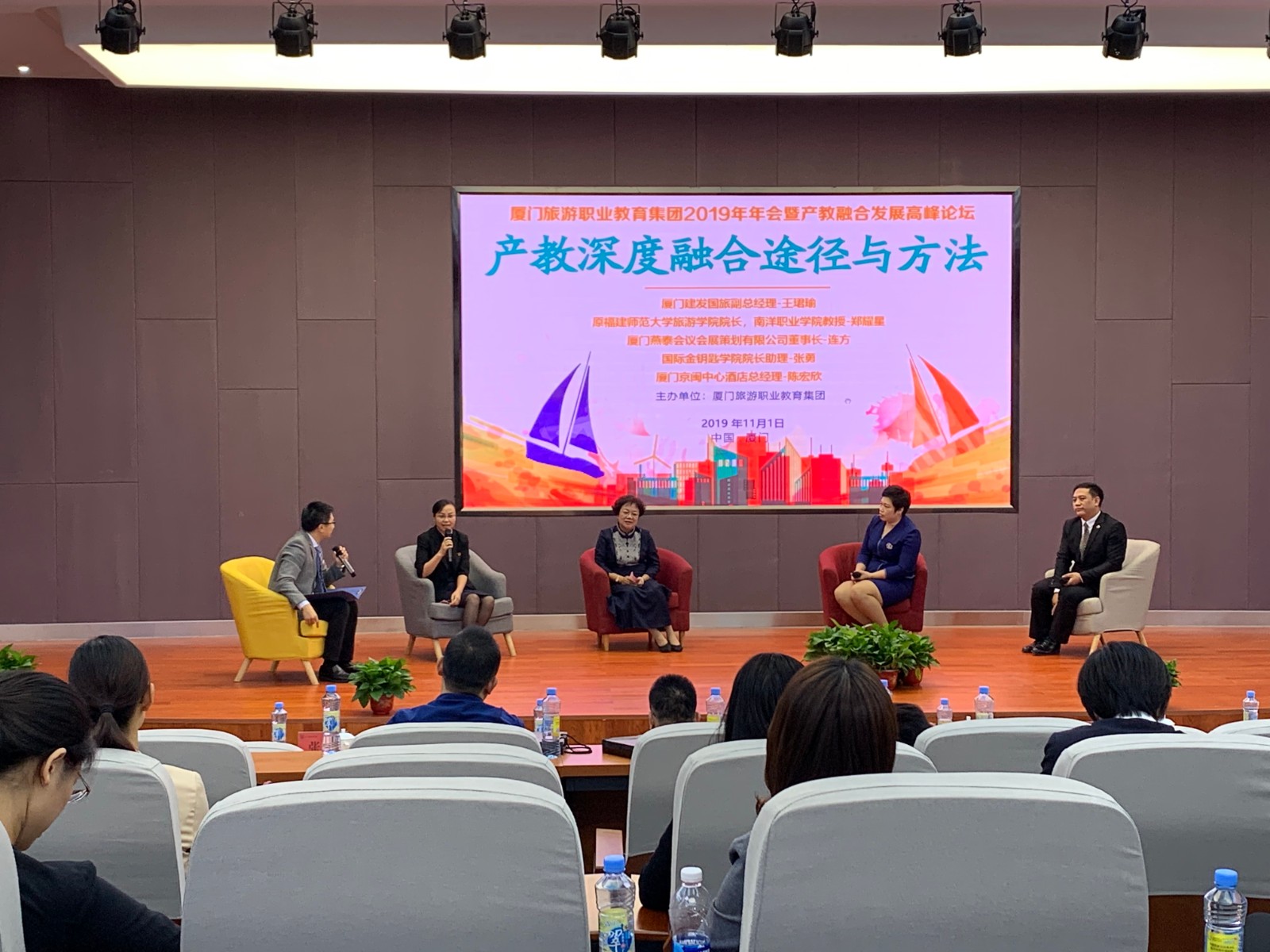 南洋社讯 今日(11月1日)上午10:00,厦门旅游职业教育集团2019年年会暨产教融合发展高峰论坛在南洋学院仙岳报告厅隆重举行。厦门市教育局高教与职教处处长陈哲新,华侨大学旅游学院创院院长、旅游安全研究院院长郑向敏,厦门旅游职业教育集团理事长、南洋学院董事长鲁加升,原福建师范大学旅游学院院长、厦门南洋学院教授郑耀星,厦门建发国旅集团副总经理王珺瑜,厦门燕泰会议会展公司董事长、厦门会展协会副理事长连芳,京闽中心酒店总经理陈宏欣,国际金钥匙学院院长助理张勇出席论坛。陈哲新处长致辞;鲁加升董事长作年度工作报告;外国语与旅游学院执行院长、厦门旅游职教集团副总经理崔筱力主持会议。厦门市旅游相关企业高管、市高职院校负责人及全体会员单位代表、旅游管理专业群师生代表参加开幕式。