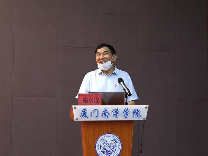 在仙岳报告厅,施水成书记详细介绍了南洋学院党建思政引领发展、党建思政工作特色、管理体制和运行机制等情况。结合习近平总书记关于高校党组织建设的相关论述和南洋学院党组织建设的工作实际,讲解了学校的基本办学情况和两年来作为全省首批高校党建工作示范点的建设工作的亮点做法及取得的突出成绩。基础扎实的党建思政工作,亮点纷呈的6大党建思政平台,开拓创新的党建思政举措。
