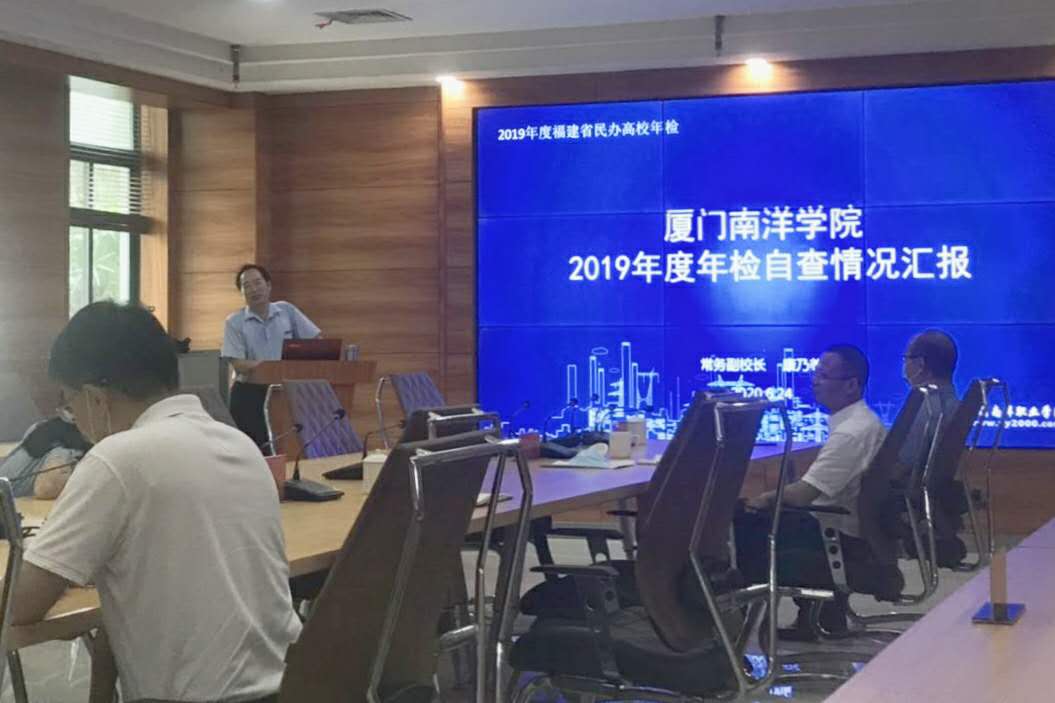 康乃美常务副校长代表南洋学院向检查组做了2019年度年检自查情况汇报,通过党的建设和思想政治工作持续加强、办学投入保障到位、依法办学规范管理、师生权益全面保障、资产财务管理规范、学校安全稳定等五方面报告了南洋学院自查情况。检查组在听取完汇报后,对我校工作表示肯定,认为南洋学院各项工作基本走在全省民办高职学院前列。