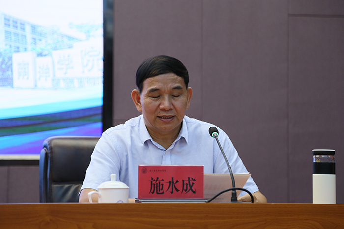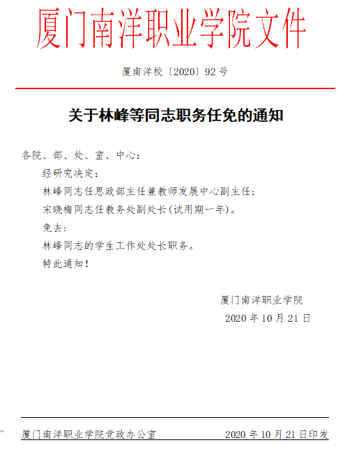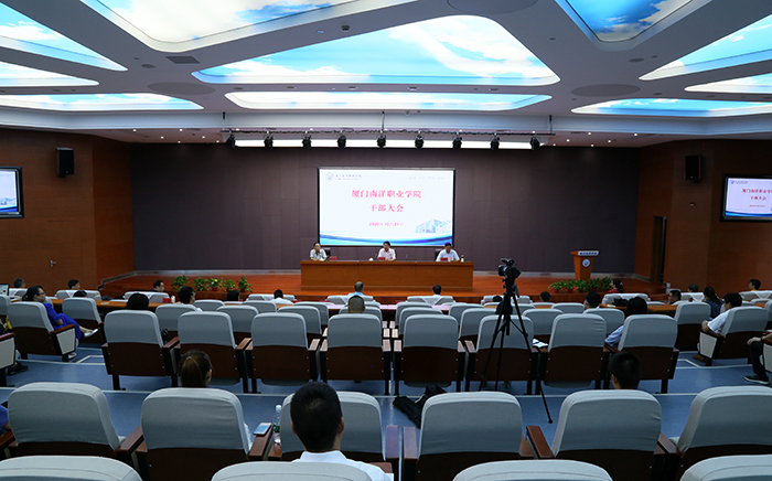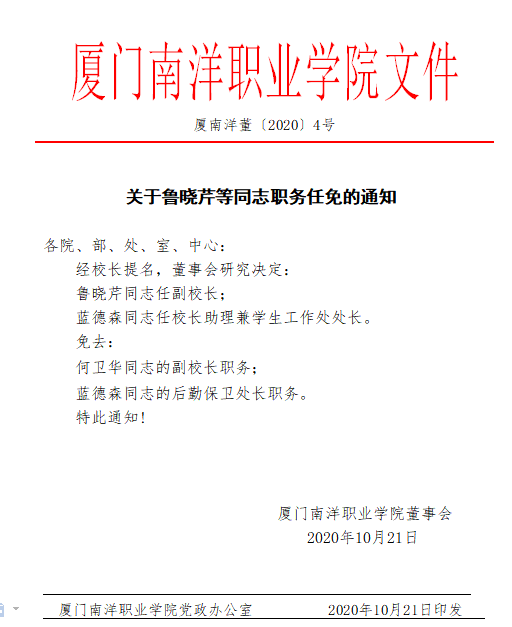 党委书记施水成宣布厦南洋董〔2020〕4号和厦南洋校〔2020〕92号两份文件,鲁晓芹同志任副校长,蓝德森同志任校长助理兼学生工作处处长,林峰同志任思政部主任兼教师发展中心副主任,宋晓梅同志任教务处副处长(试用期一年);免去何卫华同志的副校长职务,蓝德森同志的后勤保卫处长职务,林峰同志的学生工作处处长职务。