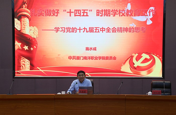 南洋社讯 为深入学习贯彻党的十九届五中全会精神,今日(12月9日)下午,我校在仙岳报告厅召开十九届五中全会精神宣讲会。党委书记施水成作宣讲报告,党委委员、副校长钟石根教授主持会议。党委委员、副董事长、副校长鲁晓芹,工会主席何卫华研究员,党委委员、校长助理兼学生工作处处长蓝德森副研究员出席会议。全校科级及以上干部、党支部书记、教研室主任、思政课教师、副教授以上职称教师及学生党员参加会议。