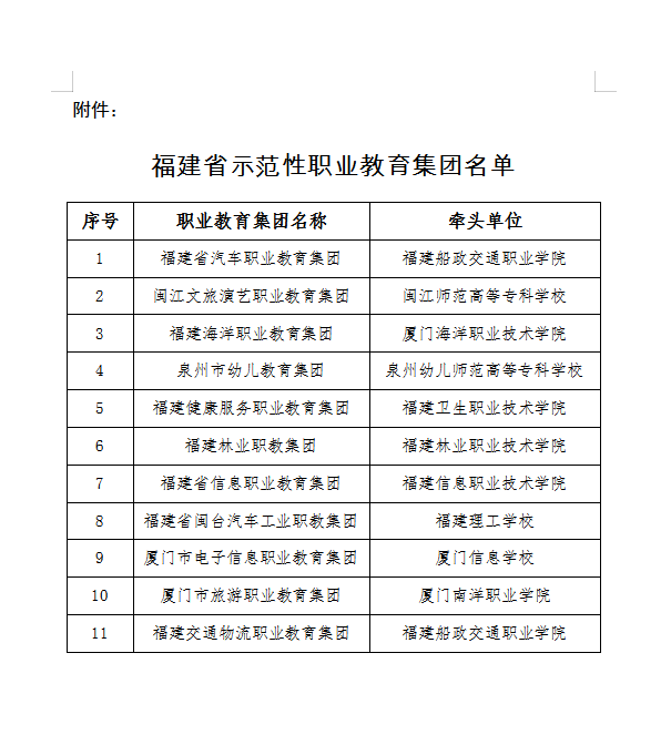 南洋社讯 近日,福建省教育厅发布《关于公布福建省示范性职业教育集团名单的通知》,由我校牵头组建的“厦门市旅游职业教育集团”获评“福建省示范性职业教育集团”。