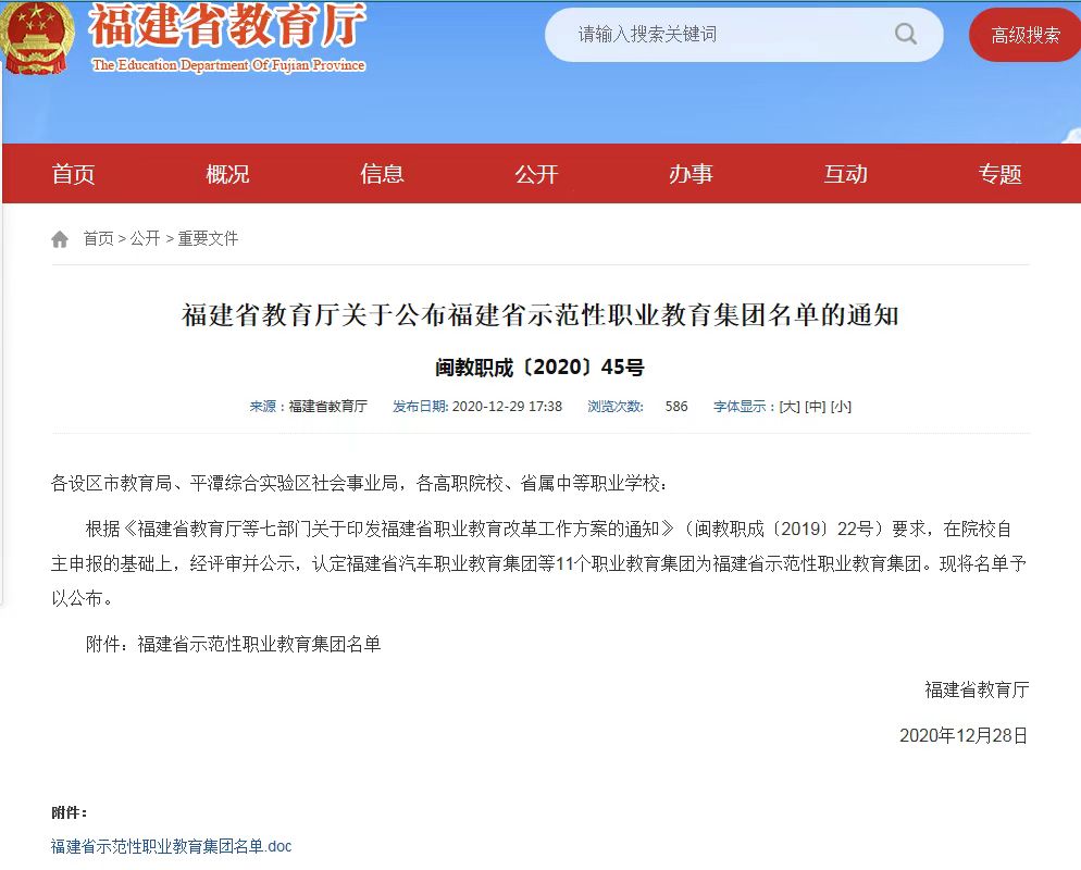 本次全省共有11所职业教育集团被认定为示范性职业教育集团,其中福州7所、厦门3所、泉州1所。此次获评,充分体现了省教育厅对我校职教集团历年来工作开展和取得成效的高度肯定和认可,学校将以此次荣誉为起点,再接再励、凝心聚力、创新发展。
