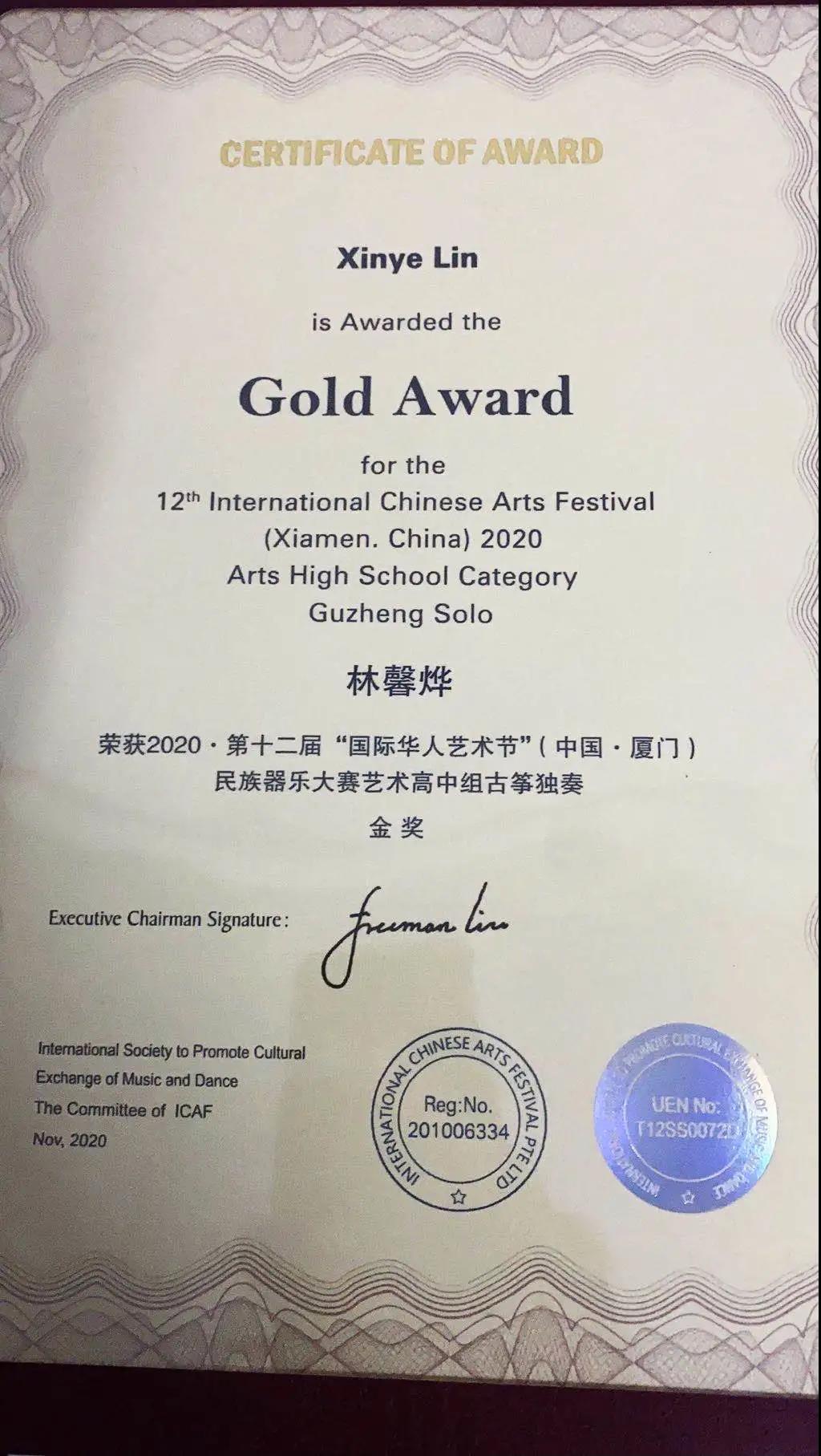 近日,2020•第十二届“国际华人艺术节”(中国•厦门)民族器乐大赛圆满落幕,我校2020级五年专音乐表演专业学子林馨烨荣获艺术高中组“古筝独奏”金奖。