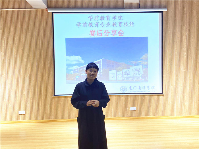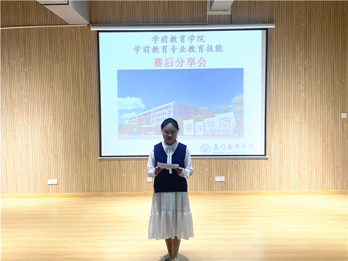 此次分享会邀请2018级学前教育专业的邱丽娇、林琳怡、邱绮思三位同学分别就三项竞赛内容进行经验分享和片段展示。这三位参赛学生在2020、2021连续两年福建省职业院校技能大赛(高职组)“学前教育专业教育技能”赛项比赛中获团体三等奖,基本功扎实,竞赛经验丰富。