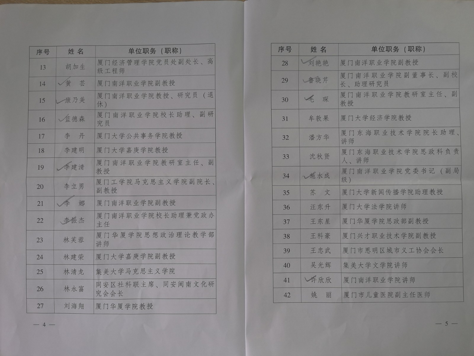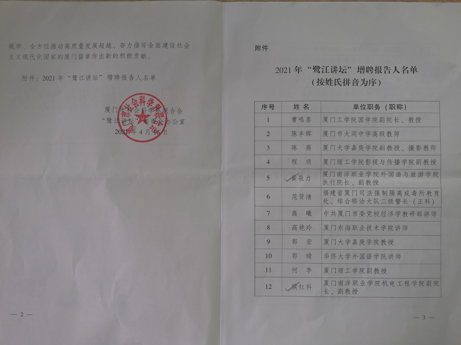 近日,厦门市社会科学界联合会公布“2021年‘鹭江讲坛’增聘报告人名单”,经我校推荐申报的14名候选人全部入选,他们是施水成、康乃美、鲁晓芹、李振杰、蓝德森、崔筱力、侯红科、黄芸、李建清、刘艳艳、毛琛、邹少琴、李娜、许欣欣。