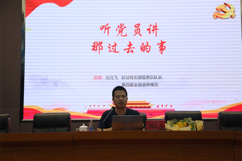 表彰会前,中共党员、第四届全国道德模范、新征程志愿服务队队长刘元飞同志以《听党员讲过去的事》为题,从红船精神、长征精神、延安精神、抗疫精神四个方面展开,并结合自身见义勇为和部队当兵经历,为参会人员进行了党史宣讲。