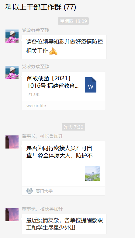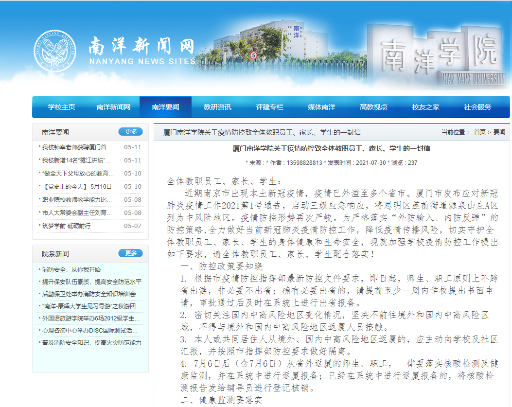 厦门南洋学院迅速行动。鲁加升校长要求全校师生加强个人防护,积极接种疫苗,非必要不外出;各部门召开新冠疫情防控工作会议,按照“两案八制”要求及时部署疫情防控工作;及时通过公众号、微信群等,发布疫情信息,提醒师生做好疫情防控,通知有关师生按照要求到当地进行疫苗接种;心理健康教育中心开通心理支持热线和网络辅导服务;保卫处加强校门管理,校外无关人员和14天内有中、高风险地区所在城市行程的人员一律不得进入校园。必要人员进入学校时一律要事先进行报备,核验身份、健康码、14日行程,检测体温无异常并戴好口罩后方可入校;后勤处采用喷雾器药物及擦拭消杀方法对校园开展全面消杀工作……