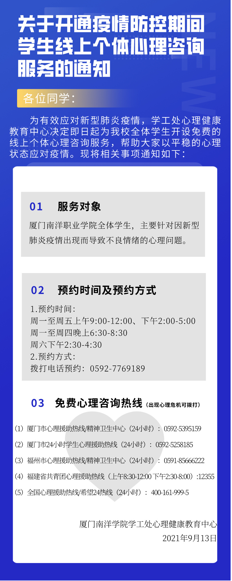 心理健康教育中心充分发挥心理健康教育专业力量,于2021年9月13日开通心理支持热线0592-7769189,热线由专人负责,增加设置夜间和周末的值班,确保及时有效的干预;同时为在校师生提供多个心理援助渠道(厦门市心理援助热线0592-5395159、福建省共青团疫情心理援助热线12355、厦门市心理咨询师协会援助热线0592-5918809)。以上心理援助热线需要通过辅导员转发至班级群,确保有需要的学生可以及时联系寻求帮助。
