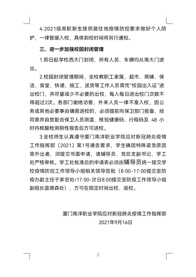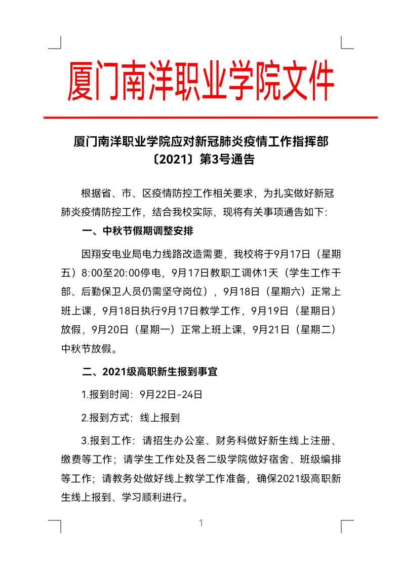 厦门南洋职业学院应对新冠肺炎疫情工作指挥部 〔2021〕第3号通告