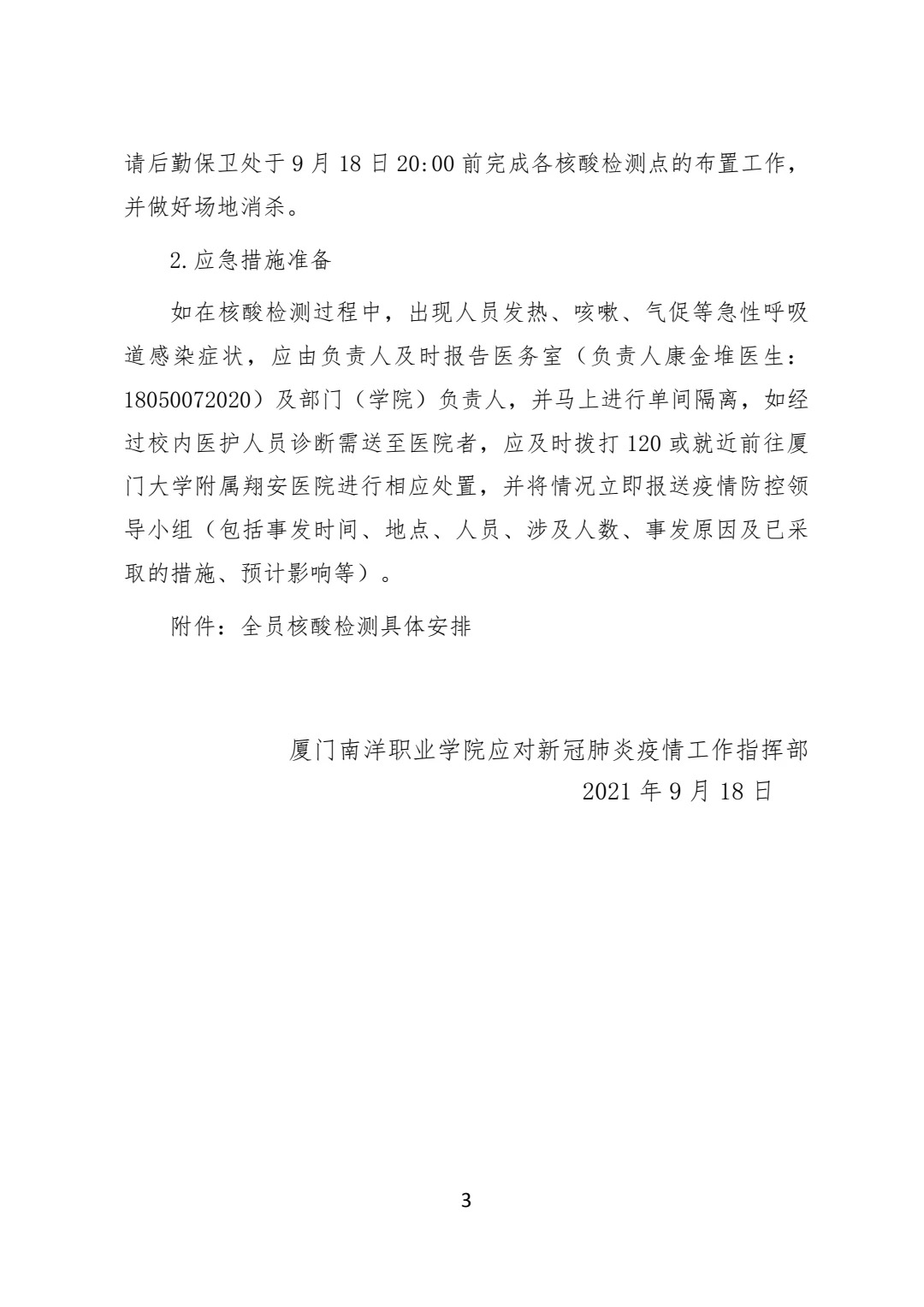 厦门南洋职业学院应对新冠肺炎疫情工作指挥部〔2021〕第4号通告