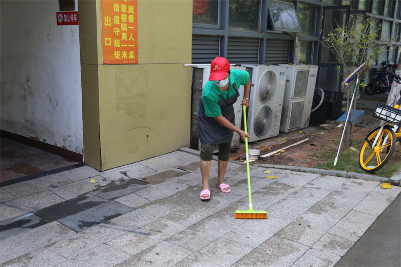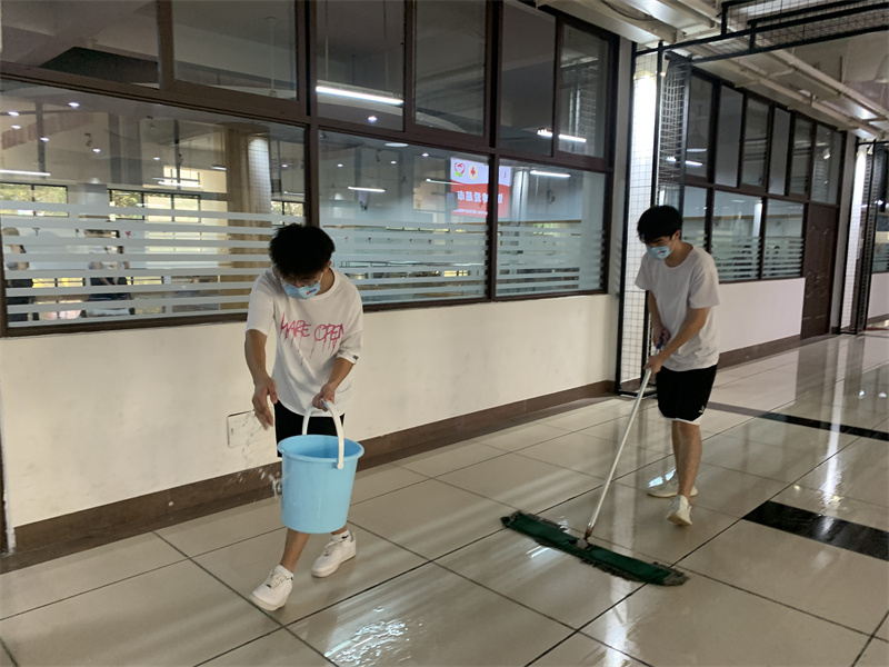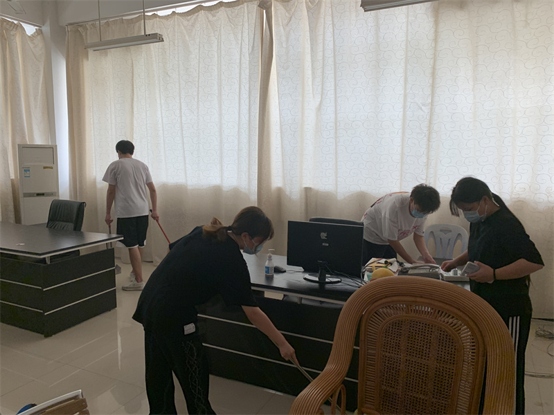 劳动过程中,人人争先、个个动手,不怕脏、不怕累。撸起袖子加油干,扫地、拖地、擦窗户、整理桌面文件,连电脑键盘也不放过。脸上流淌着的汗水,是为抗疫加油的见证。