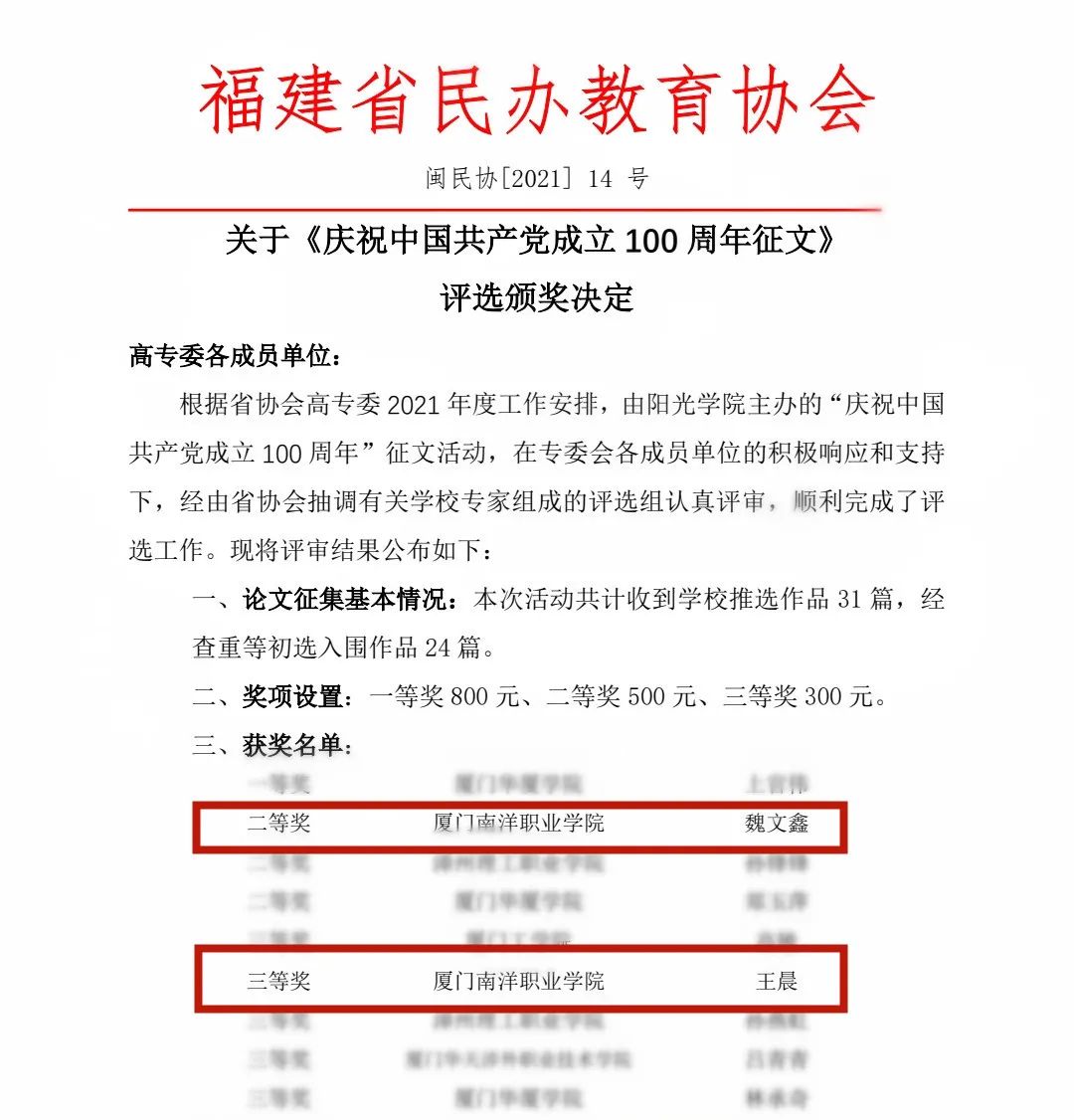百年征途,史诗当歌。近日我校教师魏文鑫、王晨在由阳光学院主办的“庆祝中国共产党成立一百周年”征文比赛中,分别获得二等奖和三等奖。