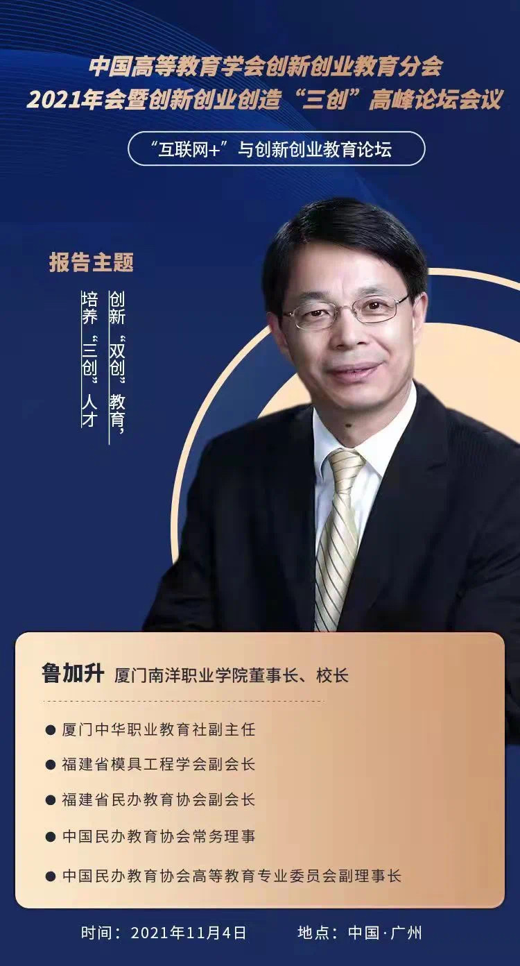 11月4日下午,董事长、校长鲁加升应邀到广州出席中国高等教育学会创新创业教育分会2021年会暨创新创业创造“三创”高峰论坛会议并作演讲,获高度肯定。