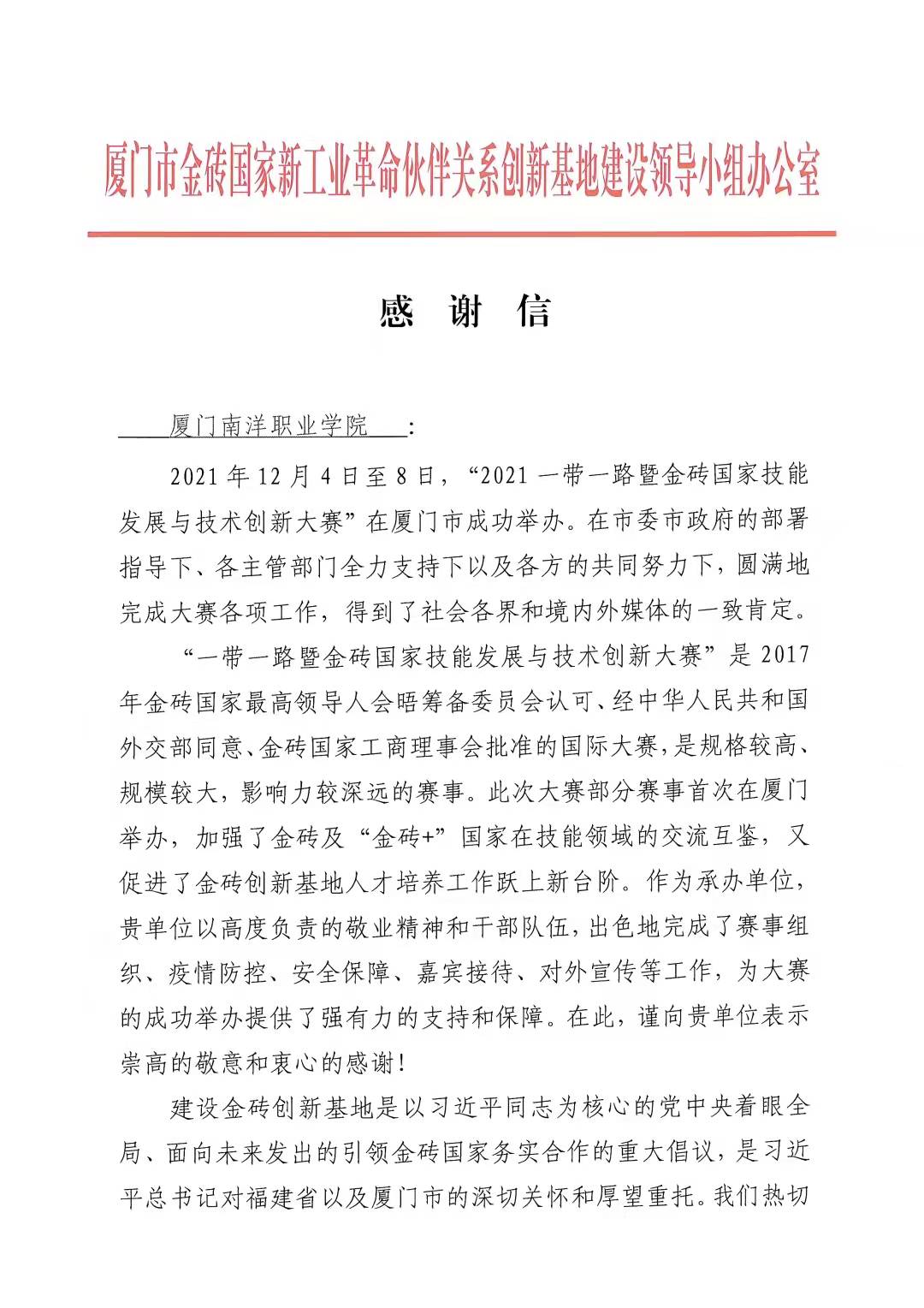 我校积极响应并大力支持国家“一带一路”倡议,主动投入并努力服务金砖国家领导人会晤。这封感谢信,是对南洋办学理念、办学实践、办学成效的肯定。作为一所“负责任”的院校获得表彰,对南洋而言,这当然不是第一次。没有最好,只有更好。南洋将以本次大赛为契机,切实落实“以中外人文交流为纽带、以前沿技术技能主题、以未来技能创造未来为愿景”的大赛精神要求,进一步落实国家职业教育改革实施方案,为培养更多高技能人才和大国工匠、促进国家就业创业和高质量发展作出南洋更大的贡献。