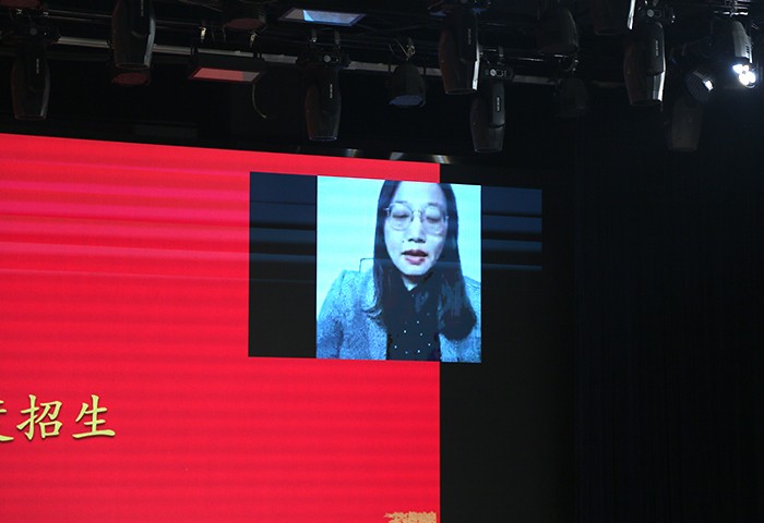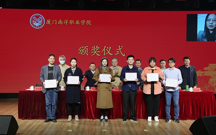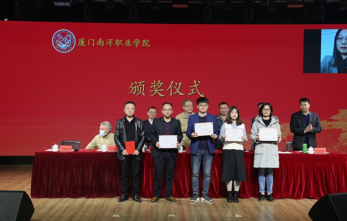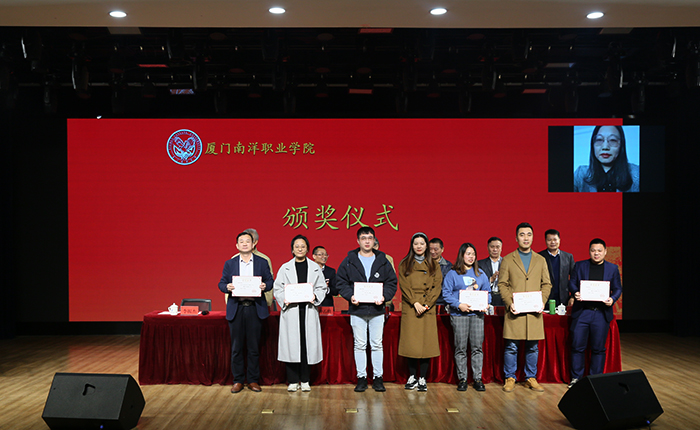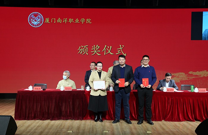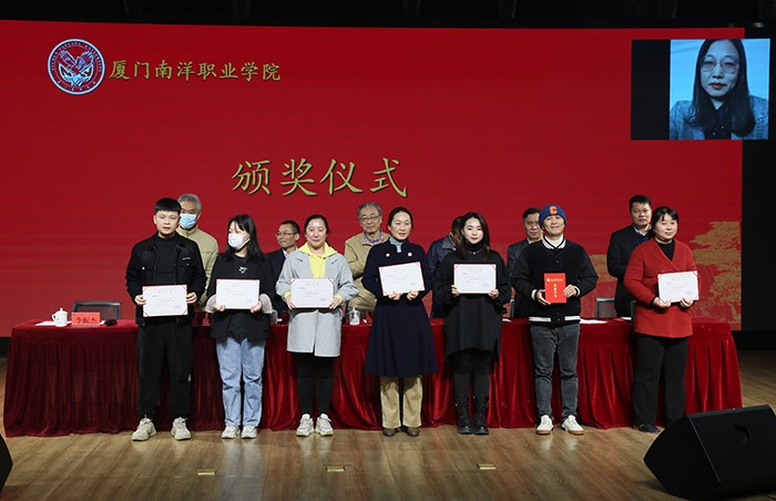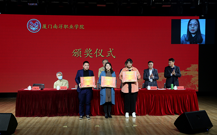 副董事长、副校长鲁晓芹宣读《厦门南洋职业学院关于表彰 2021年度招生工作先进集体和先进个人的决定》,并对受表彰者进行颁奖。