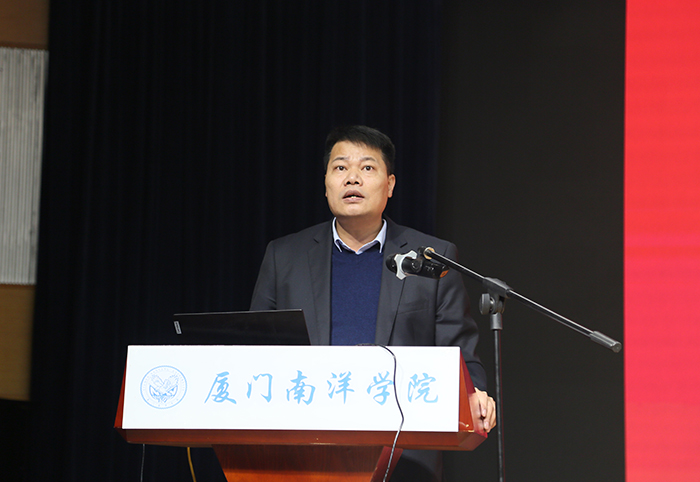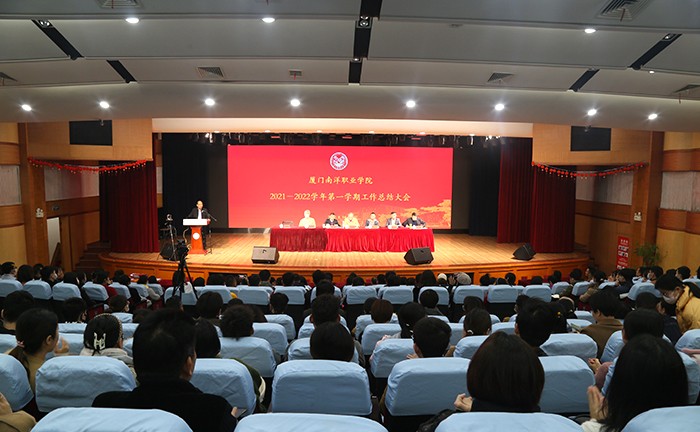 1月14日,厦门南洋职业学院2021-2022学年第一学期工作总结大会在学校活动中心礼堂以线上线下相结合的方式召开。校领导、全体教职员工参加会议。我校创校副董事长、厦门康辉国际旅行社有限公司总经理林志民先生,康辉国旅副总经理于平女士,厦门田园牧歌文旅有限公司总经理蔡朝铭先生应邀出席会议。校长助理李振杰主持会议。