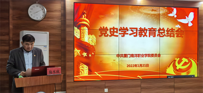 党委书记施水成在总结讲话中指出,召开学校党史学习教育总结会议主要任务是认真学习贯彻习近平总书记关于党史和党史学习教育的重要指示精神和中央、全省、全市党史学习教育总结会精神,认真学习贯彻党的十九届六中全会精神,巩固深化党史学习教育成果,引导广大党员以史为鉴、开创未来、踔厉奋发、真抓实干,助力学校高质量发展,以优异成绩迎接党的二十大胜利召开。他强调,2022年,要继续沿着习近平总书记指引的方向奋力前进, 以更高质量的党建引领民办高校高质量发展,以最优的工作实绩迎接党的二十大胜利召开。并提出四点意见。一是提高政治站位,把思想和行动统一到习近平总书记重要讲话精神上来;二是认真总结提升,不断巩固拓展党史学习教育成果;三是踔厉奋发、真抓实干,助力学校高质量发展;四是研究推进习近平总书记致厦门经济特区建设40周年贺信重要精神大学习大讨论活动,部署推动南洋事业繁荣发展、强化党内法规、做好来年工作和巩固拓展党史学习教育成果等。