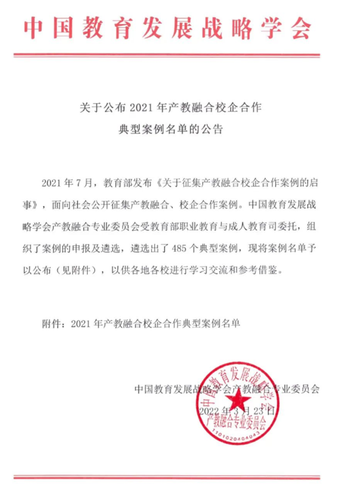 近日,中国教育发展战略学会公布了2021年教育部产教融合校企合作典型案例名单,我校《校企共建“教、产、创”三位一体特种机器人职业教育基地》案例入选2021年产教融合校企合作典型案例。