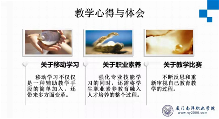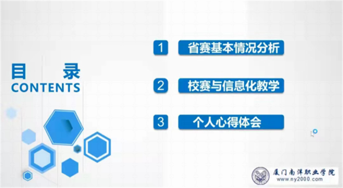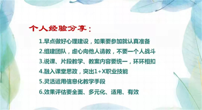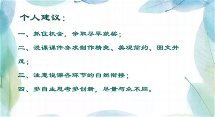 由于不少青年教师缺乏说课相关经验,张晓萍老师着重为大家分析了说课环节的基本要求并根据自己的经验和体会提出了宝贵建议。陈李笑、刘阳两位教师分别从参赛经验、片段教学赛项中信息化教学手段的运用进行了精彩分享。