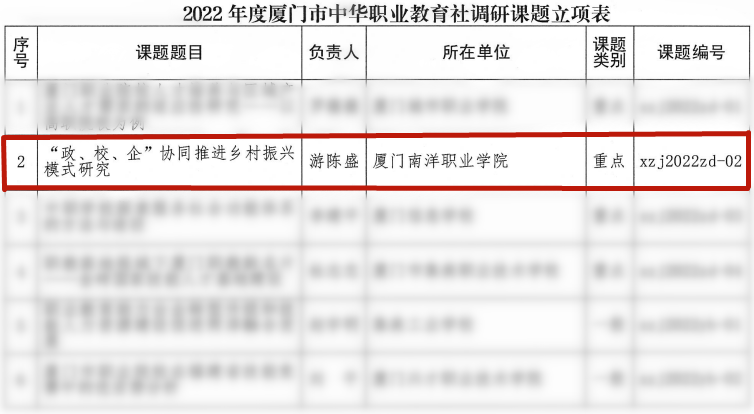 近日,厦门市中华职业教育社公布了关于2022年度调研课题立项的通知。我校游陈盛老师主持的课题《“政、校、企”协同推进乡村振兴模式研究