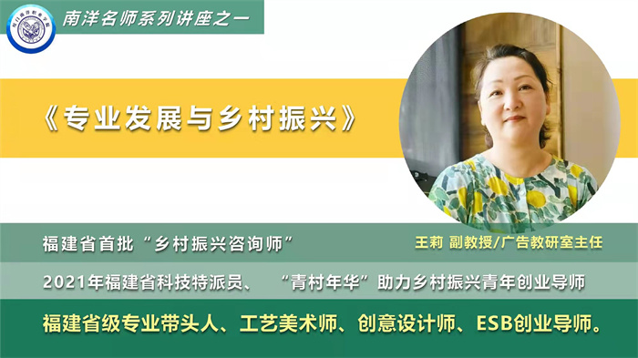 4月6日,南洋名师讲坛第一场以线上线下相结合的方式开讲。艺术设计学院广告教研室主任王莉作“专业发展与乡村振兴”专题讲座。副校长钟石根主持。