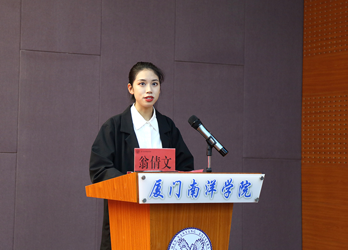典礼上,教育学院党总支学生党支部翁倩文(21级学前教育9班)代表新学员发言,她表示将严格要求自己,提高思想政治觉悟,将用实际行动践行初心,做一名有理想、有本领、有担当的青年,争取早日在思想上、组织上加入党组织。