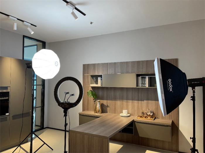 该直播间是基于原有的金牌橱柜实训室基础上进行的改造提升,对接厦门抖音电商的家居品类项目,通过专业直播设备和供应链产品的持续导入,使得直播间具有情境化的运营功能和专业性的实践教学能力。
