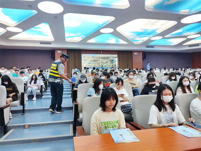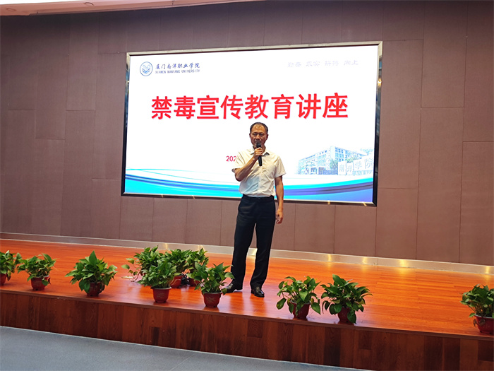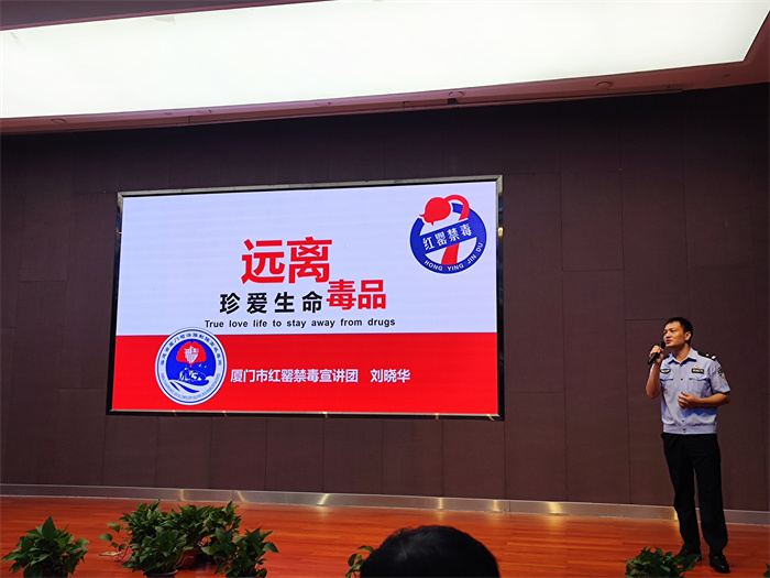 进一步助力学校文明创建工作,营造了安全稳定的校园环境,深化学校毒品预防教育工作,6月15日,我校结合“全民禁毒宣传月”及毕业季, 特邀厦门司法强制隔离戒毒所四大队副大队长、厦门市红罂禁毒宣讲团成员刘晓华警官为同学们带来禁毒知识讲座。保卫科同志及学生代表近200名现场聆听讲座。