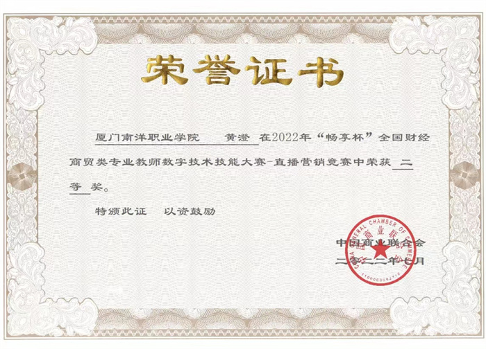 7月16日,由中国商业联合会主办的2022年“畅享杯”全国财经商贸类专业教师数字技术技能大赛-直播营销赛项落下帷幕。经过长达数天的激烈竞争和两周的严格评审,我校经济管理学院/三创学院黄澄老师斩获二等奖。